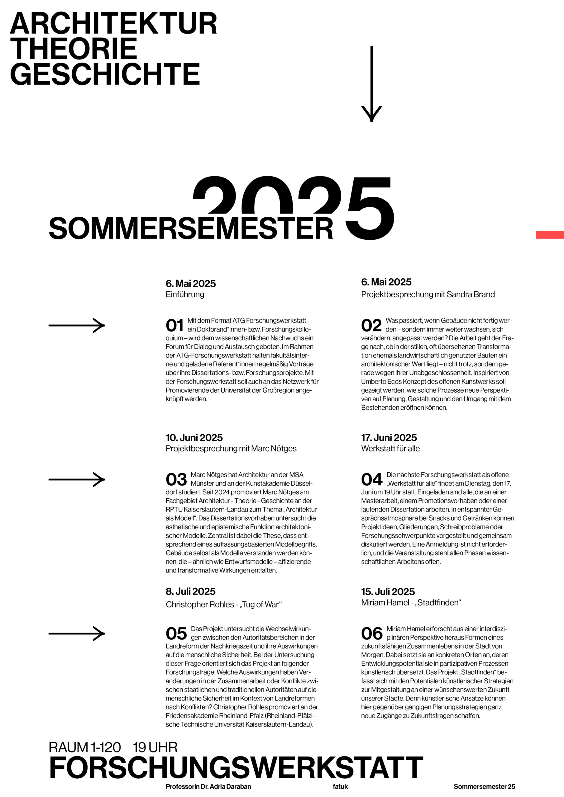 Eine kritische und engagierte Auseinandersetzung mit den veränderten Erfordernissen der Gegenwart erfolgt im Dialog. Das Fachgebiet ARCHITEKTUR – THEORIE – GESCHICHTE beabsichtigt, ein Zentrum aufzubauen, das fortlaufende Forschung und kontinuierlichen Diskurs der unterschiedlichen Fachgebiete konsolidiert, koordiniert und nach außen trägt.